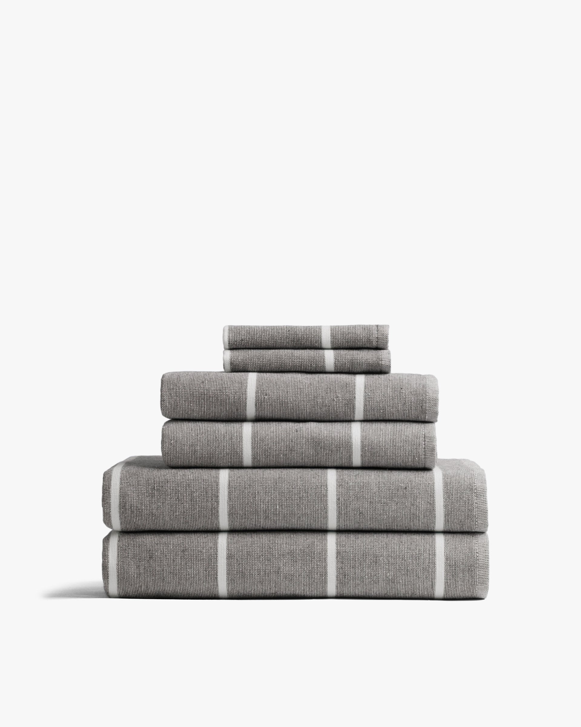 Our Mediterranean-inspired fouta bath linens are quick-drying, absorbent and understatedly cool. Bring clean minimalism to the bathroom with these strikingly simple line-patterned towels.